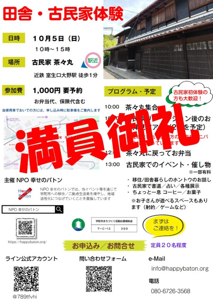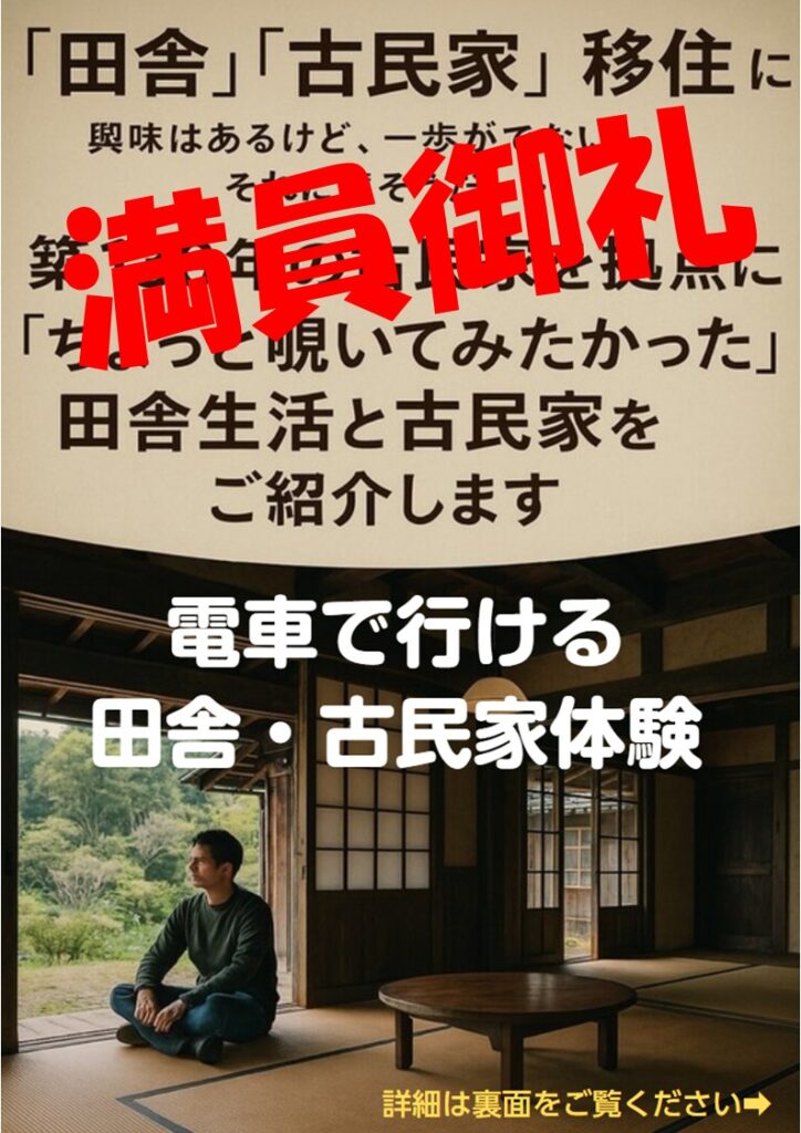 【満員御礼】電車で行ける「田舎・古民家体験」イベント! 2025年9月25日 最終更新日時 : 2025年9月25日 happybaton 今回は、初めての駅近古民家をメイン会場とするイベントでしたが、お陰様で『満員御礼』となりました。ご応募された方、本当にありがとうございました! 当日お会いできるのを楽しみにしております。また、もしこれから申込みをしようと思っていたという方がいれば、大変に申し訳けございません。次回のイベント参加をお待ちしています。 \ 最新情報をチェック / FacebookXBlueskyHatenaCopy