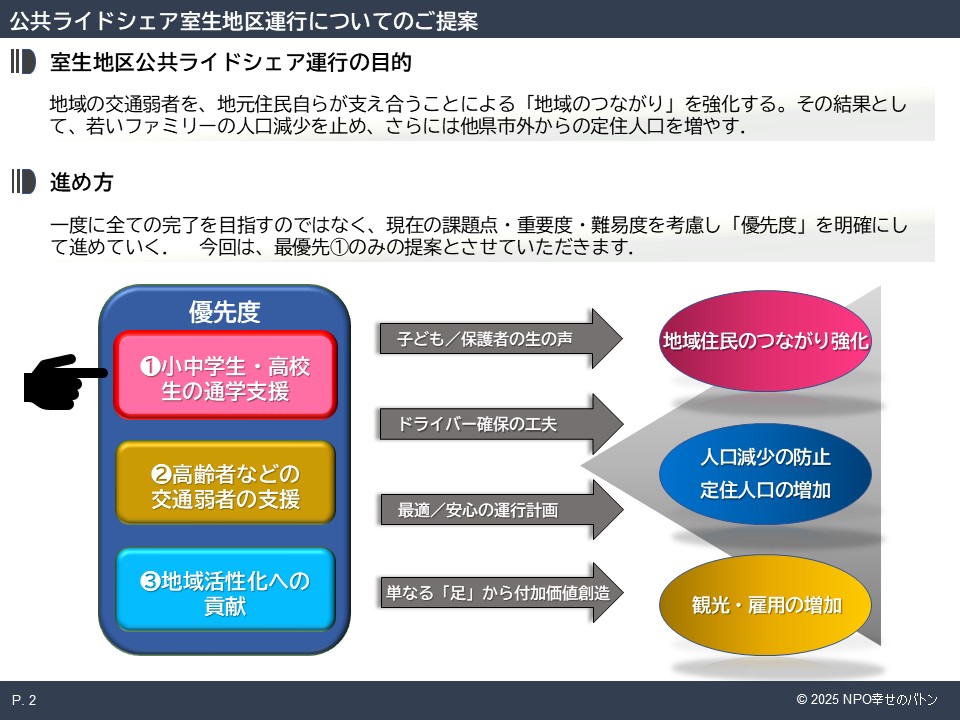 そんな環境を少しでも改善したく、我々としては「小中学生・高校生の通学支援」を第一に検討していきたいと考えています。