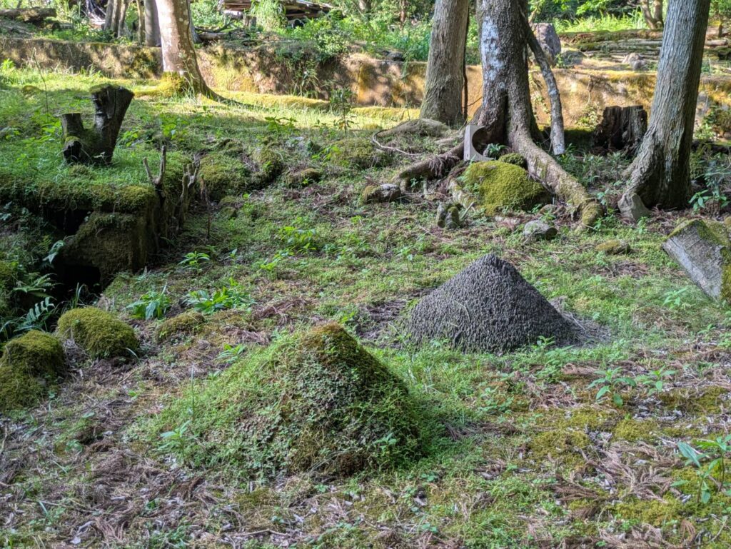 自然の営みは、全てが無常。今では苔の森と化した館 の周辺の至るところに鎮座し、樹木や草花の陰に隠れている大小のエコ・フクロウ慈眼さんたち。目を合わすだけで和ませてくれる。