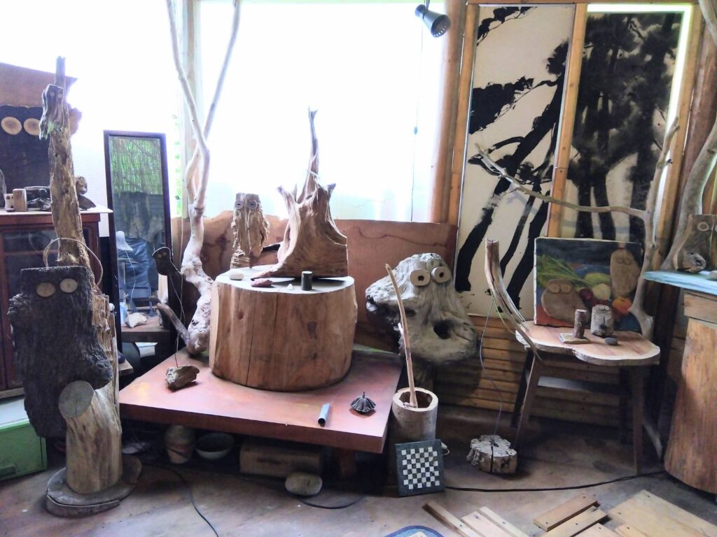 エコ・フクロウ慈眼さん作りをはじめ、建物(ログ・キャビン)や内外装(ギャラリー&テラス)、庭園も、ほとんどのものが手作り”だ。統一性はないが、ご縁があって集まってきた 自然素材のアートフルなコラボ展示場となっている。
